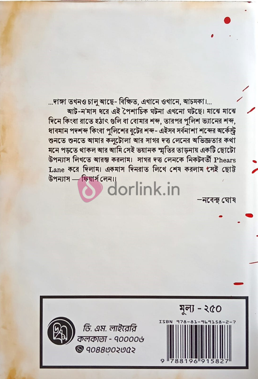লেখক নবেন্দু ঘোষ নিজে এই ভয়াবহ ঘটনার প্রত্যক্ষদর্শী ছিলেন। Phears Lane-এ ঘটে যাওয়া নির্মম হত্যাকাণ্ড, রক্তাক্ত রাস্তা, ঘরবাড়ি জ্বলতে থাকা দৃশ্য এবং অসহায় মানুষের আর্তনাদ—সবকিছুই তিনি নিজের চোখে দেখেছেন। সেই অভিজ্ঞতা থেকেই তিনি লিখেছেন "ফিয়ার্স লেন", যা শুধুমাত্র এক উপন্যাস নয়, বরং একটি ঐতিহাসিক দলিল।