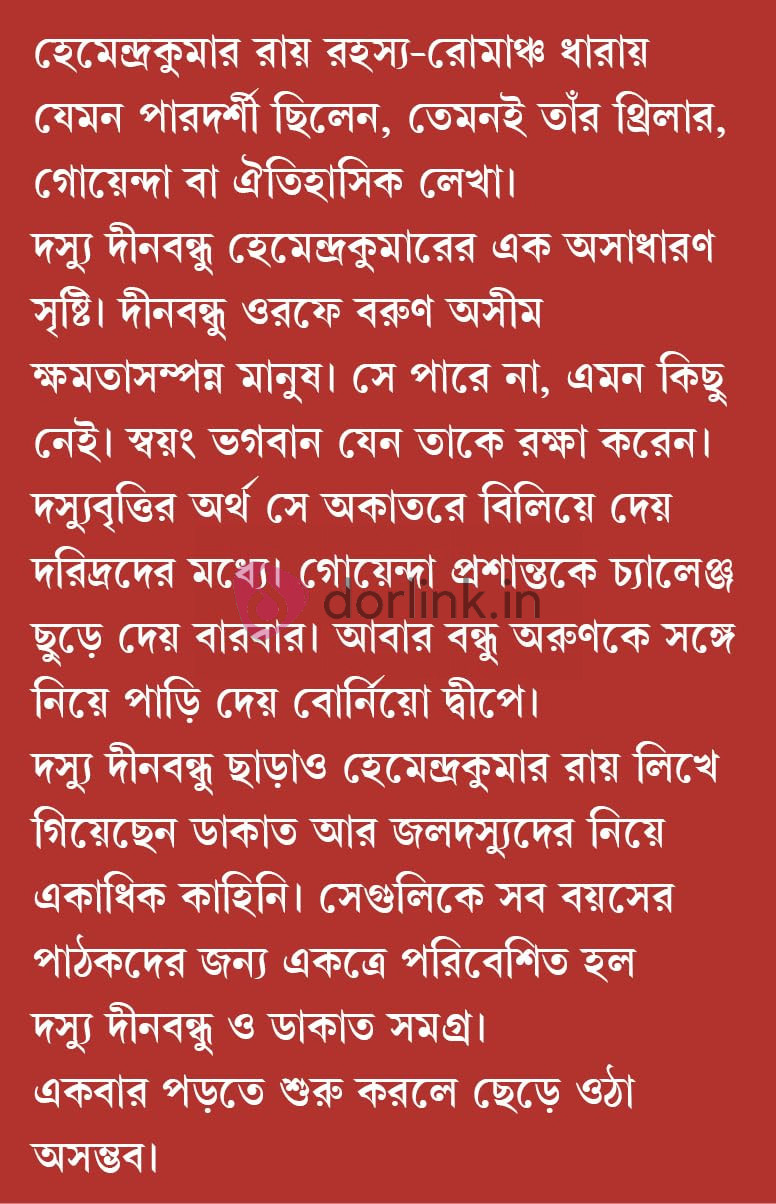 দস্যু দীনবন্ধু ছাড়াও হেমেন্দ্রকুমার রায় লিখে গিয়েছেন ডাকাত আর জলদস্যুদের নিয়ে একাধিক কাহিনি। সেগুলিকে সব বয়সের পাঠকদের জন্য একত্রে পরিবেশিত হল দস্যু দীনবন্ধু ও ডাকাত সমগ্র। একবার পড়তে শুরু করলে ছেড়ে ওঠা অসম্ভব।