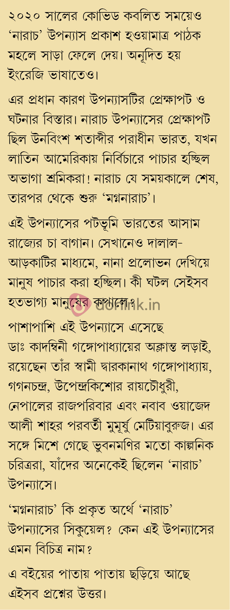 আসামের চা-বাগানের পটভূমিতে নির্মিত এই উপন্যাস শুধুমাত্র শ্রমজীবী মানুষদের অসহায়ত্বের আখ্যান নয়—এটি এক ঐতিহাসিক খতিয়ান, যেখানে উঠে এসেছে কিভাবে দালাল-আড়কাঠির প্রলোভনে পড়ে হাজার হাজার মানুষ ছিন্ন হয়েছে নিজের মাটি, সংস্কৃতি ও পরিবার থেকে। চা-বাগানের কুয়াশার আড়ালে যে অদৃশ্য শৃঙ্খল, তা এখানে স্পষ্ট হয়ে ওঠে নির্মম বর্ণনায়।
