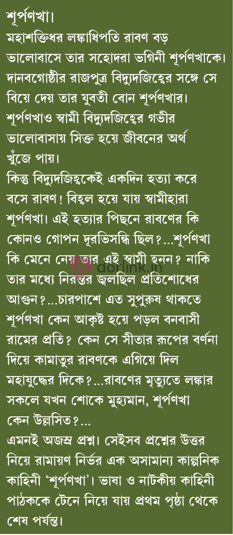 হরিশংকর জলদাস তাঁর তীব্র ভাষা ও নাটকীয় কাহিনীবিন্যাসে শূর্পণখার জীবনের এই অসামান্য পুনর্নির্মাণে এক নারীর অভ্যন্তরীণ লড়াই, ভালোবাসা, লাঞ্ছনা ও প্রতিশোধের অন্তঃপ্রবাহকে তুলে ধরেছেন এমনভাবে, যা পাঠককে শুধু চমকে দেয় না—তাকে ভেতর থেকে আলোড়িত করে।