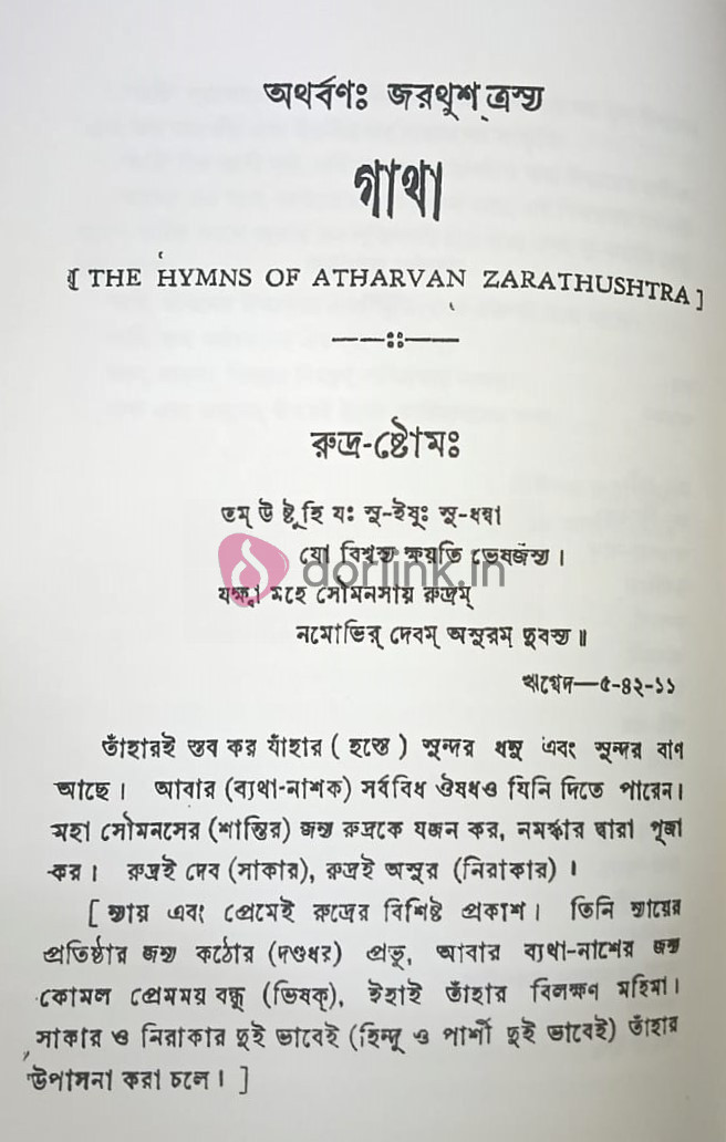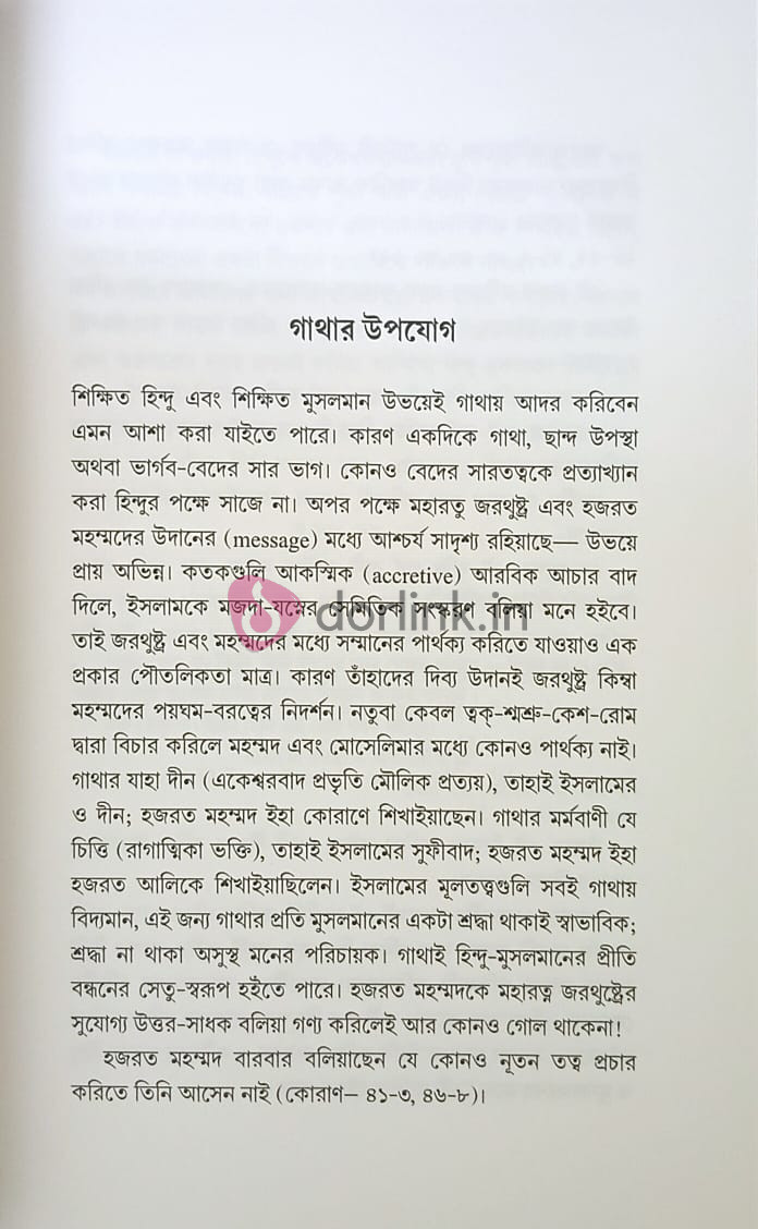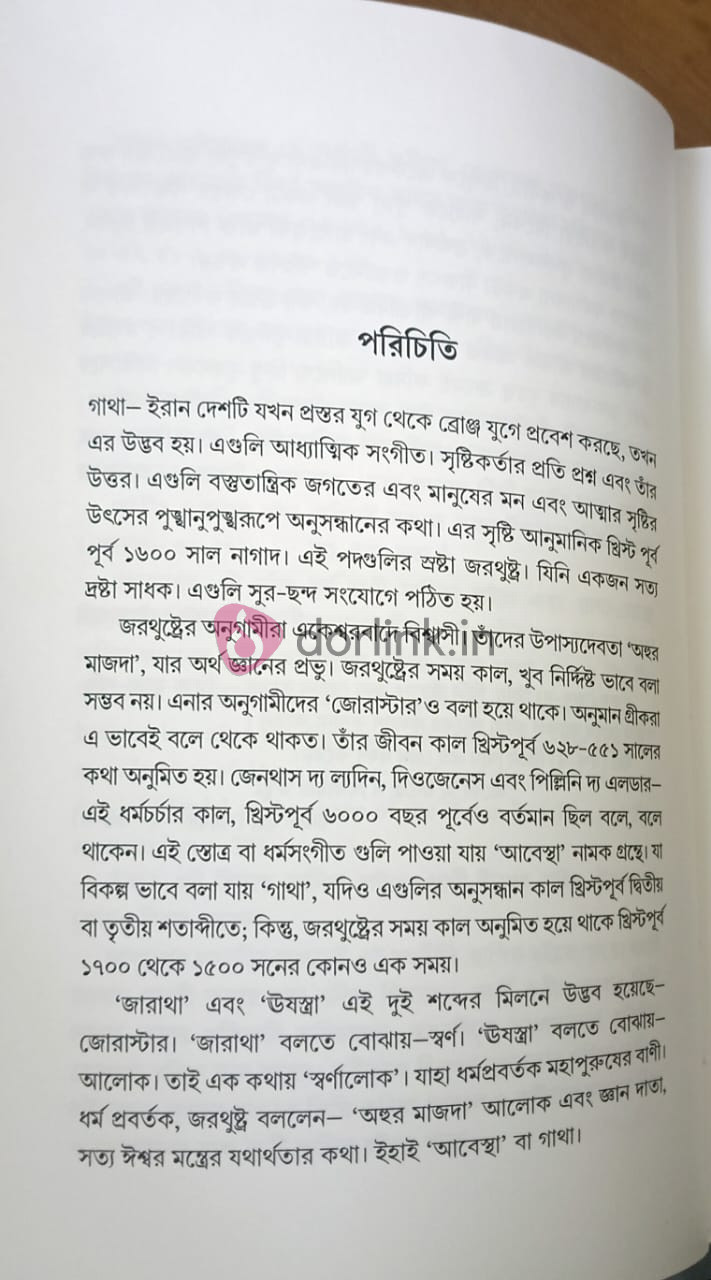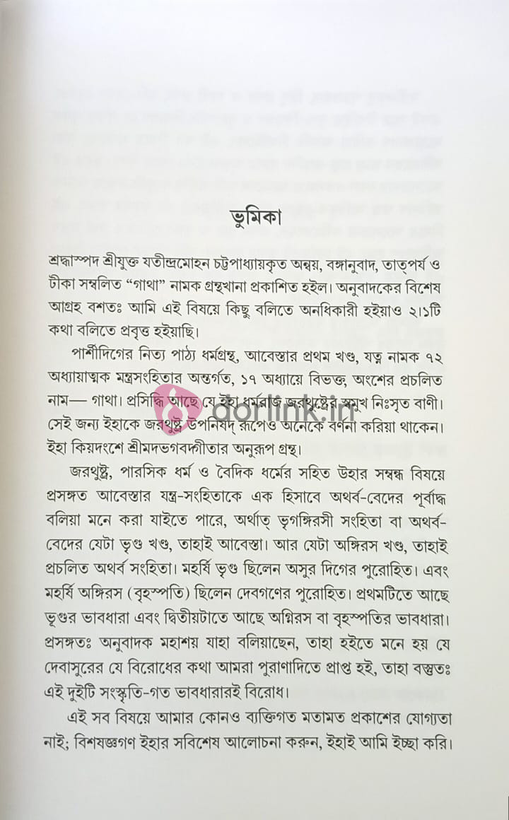 এই বইটি মূল জেন্দ আবেস্তা থেকে প্রথম বাংলা অনুবাদ, এখানে অনুবাদক ও গবেষক শ্রদ্ধেয় শ্রী যতীন্দ্রমোহন চট্টোপাধ্যায় জরথুষ্ট্রীয় গাথার বঙ্গানুবাদ, টীকা ও বিশ্লেষণের মাধ্যমে ধর্মতত্ত্ব, নৈতিকতা ও দর্শনের এক নতুন ব্যাখা উপস্থাপন করেছেন। বৈদিক সাহিত্য ও দর্শনের আলোকে গাথার ভাবধারাকে পর্যালোচনা করে, তিনি উন্মোচন করেছেন দুই সংস্কৃতির সাদৃশ্য ও বৈসাদৃশ্য। বিশেষভাবে, গাথার সংগীতধর্মী মন্ত্রসমূহ ও বেদীয় ঐতিহ্যের তুলনায় এ গ্রন্থে উঠে এসেছে পুরাতন পারসিক ধর্মের মূল দর্শনের একটি স্বচ্ছ রূপরেখা।