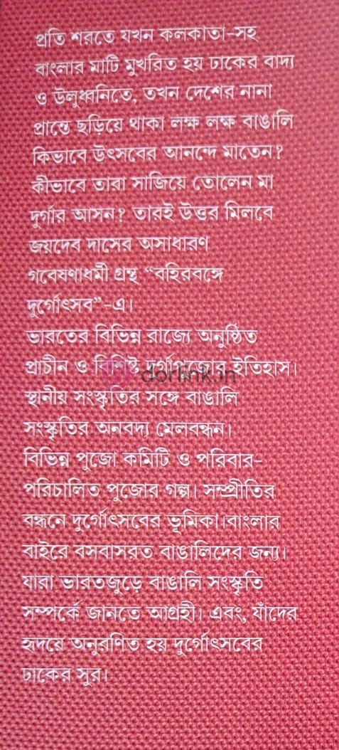 প্রতি শরতে যখন কলকাতা-সহ বাংলার মাটি মুখরিত হয় ঢাকের বাদা ও উলুধ্বনিতে, তখন দেশের নানা প্রান্তে ছড়িয়ে থাকা লক্ষ লক্ষ বাঙালি কিভাবে উৎসবের আনন্দে মাতেন? কীভাবে তারা সাজিয়ে তোলেন মা দুর্গার আসন? তারই উত্তর মিলবে জয়দেব দাসের অসাধারণ গবেষণাধর্মী গ্রন্থ "বহিরবঙ্গে দুর্গোৎসব"-এ।
