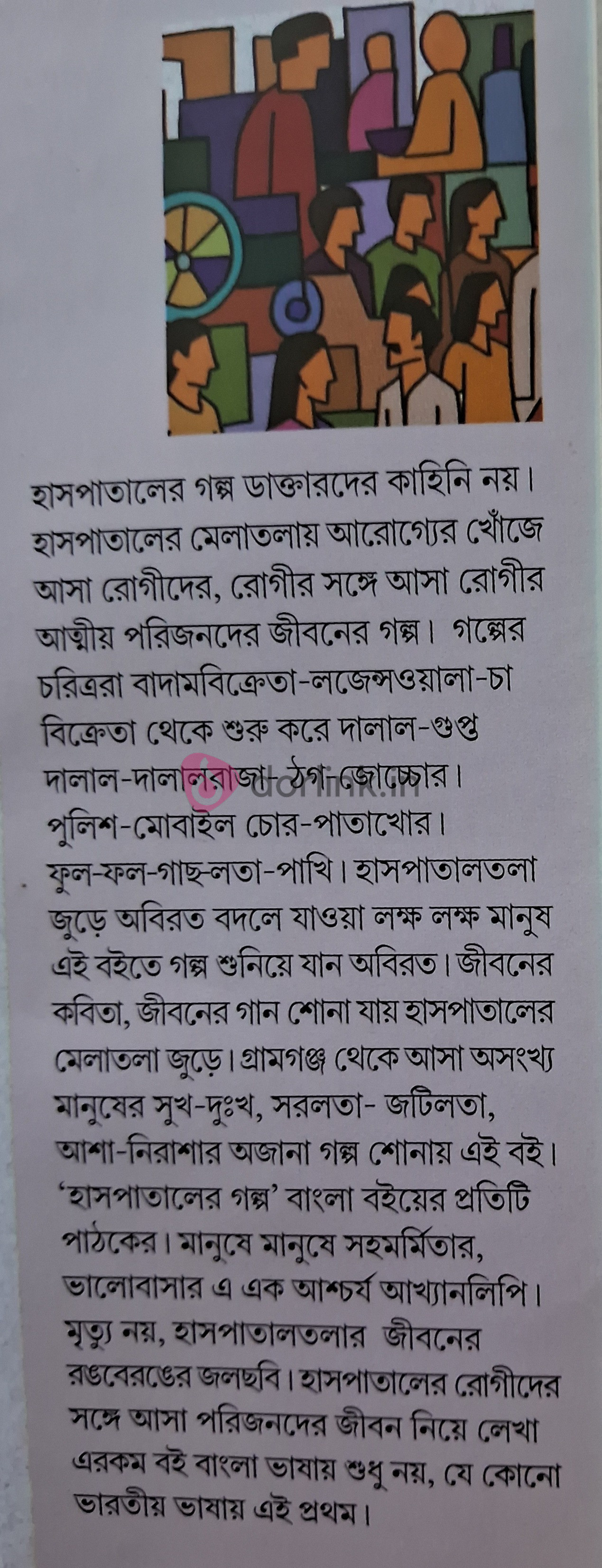 হাসপাতালের গল্প কোনো ডাক্তার বা চিকিৎসাবিজ্ঞানের কাহিনি নয়। এই বইয়ের পটভূমি হাসপাতালের মেলাতলা — যেখানে প্রতিদিন হাজার হাজার মানুষ ভিড় করেন আরোগ্যের আশায়। রোগীদের সঙ্গে আসা মা-বাবা, ভাই-বোন, স্বামী-স্ত্রী, সন্তান কিংবা প্রতিবেশীরা নিয়ে আসেন তাঁদের নিজস্ব ছোট ছোট গল্প।