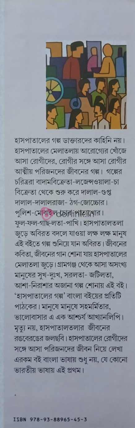 “হাসপাতালের গল্প” আসলে মানুষের গল্প। রোগের চেয়ে বড় হয়ে ওঠে সম্পর্ক, সহানুভূতি, ভালোবাসা। মৃত্যুর নয়, বরং জীবনের এক রঙিন কোলাজ হয়ে ওঠে এই আখ্যান। বাংলাভাষায় এমন বই এই প্রথম — যেখানে আলো পড়ে রোগীর পাশে বসে থাকা সেই মানুষটার চোখে জমে থাকা জলের কণায়।