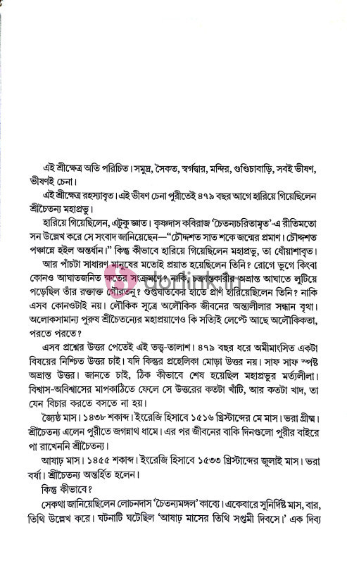 বাংলা উড়িষ্যার ইতিহাসের এক বহু আলোচিত কিন্তু অনালোকিত অধ্যায়ের উন্মোচন এই বই। কোথায়, কবে, কীভাবে শ্রীচৈতন্যের মর্ত্যলীলা সাঙ্গ হয়েছিল তার পুঙ্খনাপুঙ্খ বর্ণনা। অকপট উচ্চারণে ধোঁয়াশার অপসারণ। উপন্যাস নয়, ইতিহাস। মিথ ভাঙার দীপ প্রয়াস।