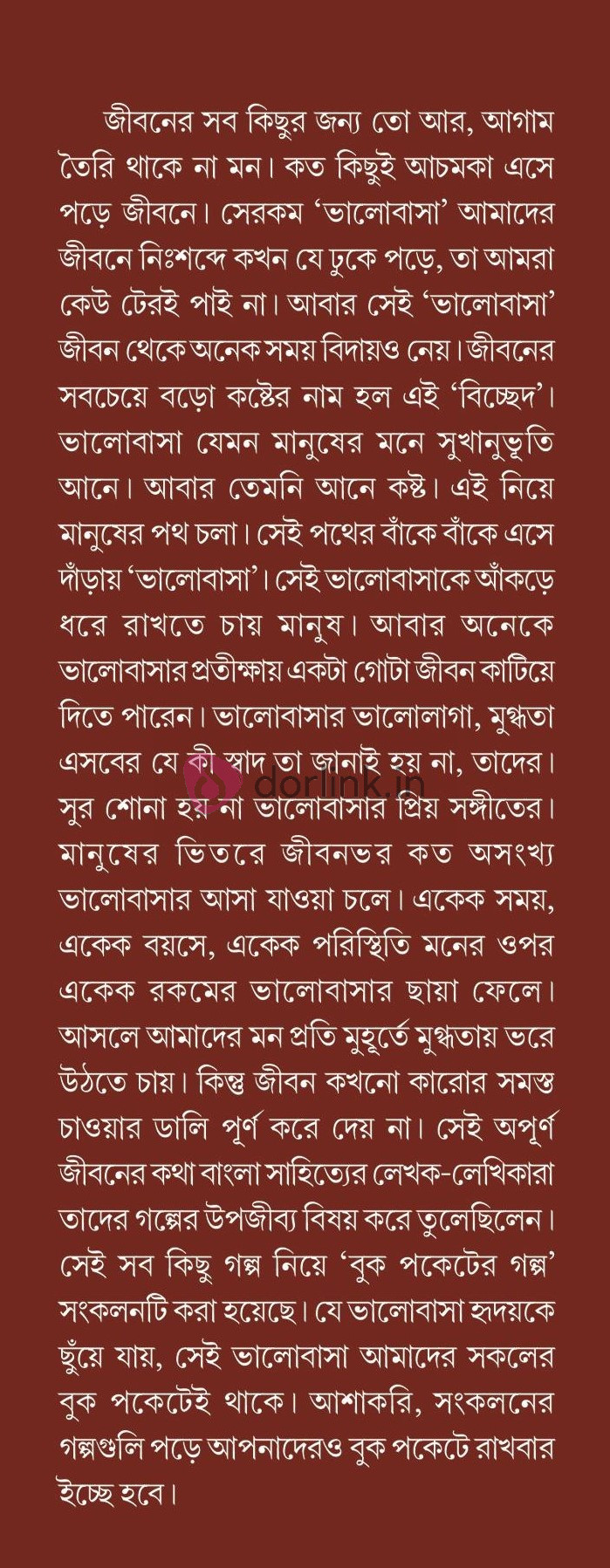 কিন্তু জীবন কখনো কারোর সমস্ত চাওয়ার ডালি পূর্ণ করে দেয় না। সেই অপূর্ণ জীবনের কথা বাংলা সাহিত্যের লেখক-লেখিকারা তাদের গল্পের উপজীব্য বিষয় করে তুলেছিলেন। সেই সব কিছু গল্প নিয়ে 'বুক পকেটের গল্প' সংকলনটি করা হয়েছে। যে ভালোবাসা হৃদয়কে ছুঁয়ে যায়, সেই ভালোবাসা আমাদের সকলের বুক পকেটেই থাকে। আশাকরি, সংকলনের গল্পগুলি পড়ে আপনাদেরও বুক পকেটে রাখবার ইচ্ছে হবে।