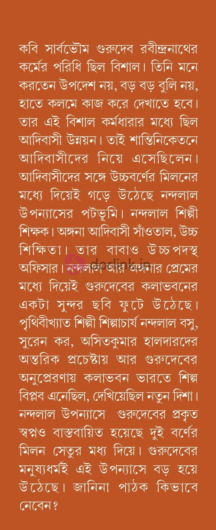 কবি সার্বভৌম গুরুদেব রবীন্দ্রনাথের কর্মের পরিধি ছিল বিশাল। তিনি মনে করতেন উপদেশ নয়, বড় বড় বুলি নয়, হাতে কলমে কাজ করে দেখাতে হবে। তার এই বিশাল কর্মধারার মধ্যে ছিল আদিবাসী উন্নয়ন। তাই শান্তিনিকেতনে আদিবাসীদের নিয়ে এসেছিলেন। আদিবাসীদের সঙ্গে উচ্চবর্ণের মিলনের মধ্যে দিয়েই গড়ে উঠেছে নন্দলাল উপন্যাসের পটভূমি।
