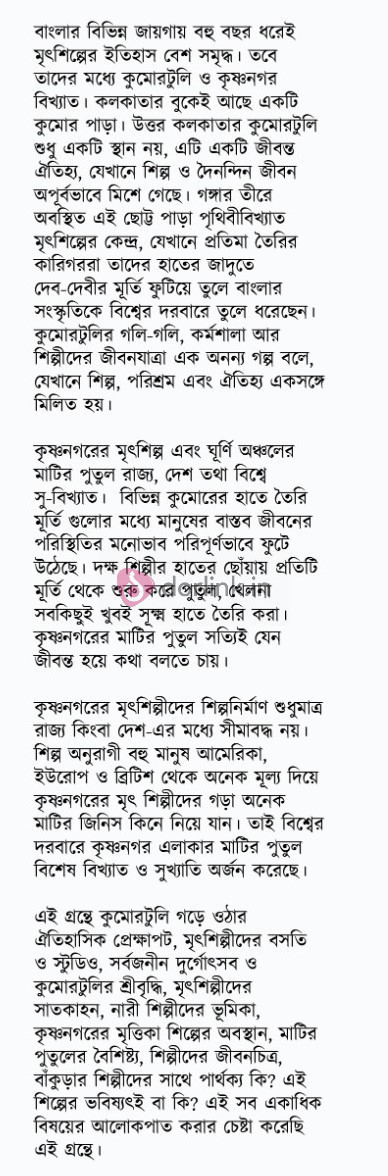 এই গ্রন্থে কুমোরটুলি গড়ে ওঠার ঐতিহাসিক প্রেক্ষাপট, মৃৎশিল্পীদের বসতি ও স্টুডিও, সর্বজনীন দুর্গোৎসব ও কুমোরটুলির শ্রীবৃদ্ধি, মৃৎশিল্পীদের সাতকাহন, নারী শিল্পীদের ভূমিকা, কৃষ্ণনগরের মৃত্তিকা শিল্পের অবস্থান, মাটির পুতুলের বৈশিষ্ট্য, শিল্পীদের জীবনচিত্র, বাঁকুড়ার শিল্পীদের সাথে পার্থক্য কি? এই শিল্পের ভবিষ্যৎই বা কি? এই সব একাধিক বিষয়ের আলোকপাত করার চেষ্টা করেছি এই গ্রন্থে।