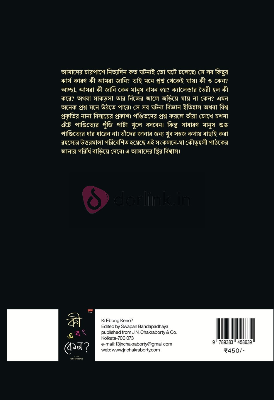 আমাদের চারপাশে নিত্যদিন কত ঘটনাই তো ঘটে চলেছে। সে সব কিছুর কার্য কারণ কী আমরা জানি? তাই মনে প্রশ্ন থেকেই যায়। কী ও কেন? আচ্ছা, আমরা কী জানি কেন মানুষ বামন হয়? ক্যালেন্ডার তৈরী হল কী করে? অথবা মাকড়সা তার নিজের জালে জড়িয়ে যায় না কেন? এমন অনেক প্রশ্ন মনে উঠতে পারে। সে সব ঘটনা বিজ্ঞান ইতিহাস অথবা বিশ্ব প্রকৃতির নানা বিস্ময়ের প্রকাশ। পণ্ডিতদের প্রশ্ন করলে তাঁরা চোখে চশমা এঁটে পাণ্ডিত্যের পুঁজি পাটা খুলে বসবেন। কিন্তু সাধারণ মানুষ শুষ্ক পাণ্ডিত্যের ধার ধারেন না। তাঁদের জানার জন্য খুব সহজ কথায় বাছাই করা রহস্যের উত্তরমালা পরিবেশিত হয়েছে এই সংকলনে-যা কৌতূহলী পাঠকের জানার পরিধি বাড়িয়ে দেবে। এ আমাদের স্থির বিশ্বাস।