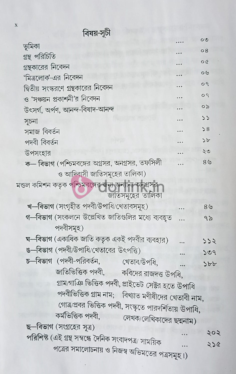 গ্রন্থটিতে বাঙালি হিন্দু সমাজের মোট ২২০টি জাতির মধ্যে ১০০টির ব্যবহৃত পদবী, খেতাব ও উপাধির এক বিস্তৃত তালিকা দেওয়া হয়েছে। তালিকাগুলি বিজ্ঞানসম্মত শ্রেণীবিন্যাসে সাজানো হওয়ায় পদবীর উৎস, বিকাশ এবং বিভিন্ন জাতির ব্যবহার সম্পর্কে এক সমগ্র ভাবনা পাওয়া যায়। একই উপনাম যে বহু জাতির মানুষ ব্যবহার করে—রায়, মুখার্জি, দত্ত প্রভৃতি—তাও স্পষ্টভাবে দেখানো হয়েছে, ফলে উপাধির মাধ্যমে বংশের আভিজাত্য নির্ণয়ের প্রচলিত ধারণা যে আজ আর নির্ভরযোগ্য নয়, তা ফুটে ওঠে।