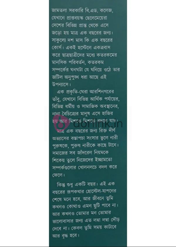 জামতলা সরকারি বি.এড. কলেজ, যেখানে প্রাপ্তবয়স্ক ছেলেমেয়েরা দেশের বিভিন্ন প্রান্ত থেকে এসে জড়ো হয় মাত্র এক বছরের জন্য। সাকুল্যে দশ মাস কি এক বছরের কোর্স। একই হস্টেলে একত্রবাস করে ছাত্রছাত্রীদের মধ্যে কতরকমের মানসিক পরিবর্তন, কতরকম সম্পর্কের ঘনঘটা যে ঘনিয়ে ওঠে তার জটিল অনুপুঙ্খ ধরা আছে এই উপন্যাসে।