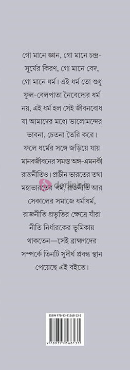 গো মানে জ্ঞান, গো মানে চন্দ্র-সূর্যের কিরণ, গো মানে বেদ, গো মানে ধর্ম। এই ধর্ম তো শুধু ফুল-বেলপাতা নৈবেদ্যের ধর্ম নয়, এই ধর্ম হল সেই জীবনবোধ যা আমাদের মধ্যে ভালোমন্দের ভাবনা, চেতনা তৈরি করে। ফলে ধর্মের সঙ্গে জড়িয়ে যায় মানবজীবনের সমস্ত অঙ্গ এমনকী রাজনীতিও। প্রাচীন ভারতের তথা মহাভারতের ধর্ম, রাজনীতি আর সেকালের সমাজে ধর্মাধর্ম, রাজনীতি প্রভৃতির ক্ষেত্রে যাঁরা নীতি নির্ধারকের ভূমিকায় থাকতেন — সেই ব্রাহ্মণদের সম্পর্কে তিনটি সুদীর্ঘ প্রবন্ধ স্থান পেয়েছে এই বইতে।