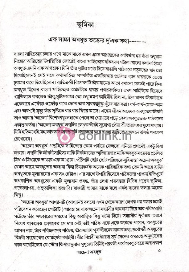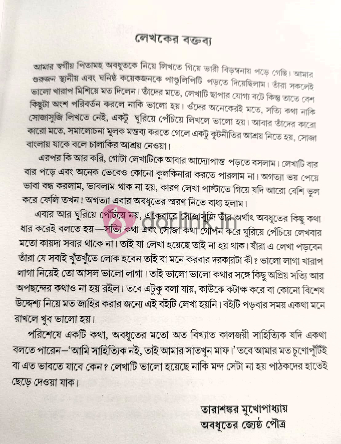 ব্যতিক্রমী সাহিত্যিক বিশেষণটি তাঁর নামের আগে বসানো যেতেই পারে কিন্তু অবধূত ছিলেন বাংলা সাহিত্যের অপ্রচলিত ধারার পথপ্রদর্শকও। ভ্রমণ সাহিত্যিক হিসেবে খ্যাতিলাভ করলেও তাঁর সৃষ্টিসম্ভারে তো শুধু ভ্রমণ কাহিনীই ছিল না, ছিল মানব জীবনটাকে একেবারে এফোঁড় ওফোঁড় করে দেখে তার সারবস্তুটুকু খুঁজে বার করা। ধর্ম-অর্থ-মোক্ষ-কাম এবং অবশ্যই মৃত্যু তাঁর সৃষ্টিতে বার বার ফিরে আসে। এহেন জীবন অন্বেষক অবধূতের জীবনী তাও আবার 'অচেনা' বিশেষণযুক্ত হাতে পেলে তা গোগ্রাসে পড়ে ফেলা অবধূতভক্ত পাঠকদের একান্ত কর্তব্য। 'অচেনা অবধূত' গ্রন্থটির লেখক তাঁরই সুযোগ্য পৌত্র শ্রী তারাশঙ্কর মুখোপাধ্যায়। যিনি ইতিমধ্যেই মহাভারত সংক্রান্ত দুটি গ্রন্থ রচনা করে বাংলা সাহিত্যের অঙ্গনে বলিষ্ঠ পদক্ষেপ রেখেছেন।