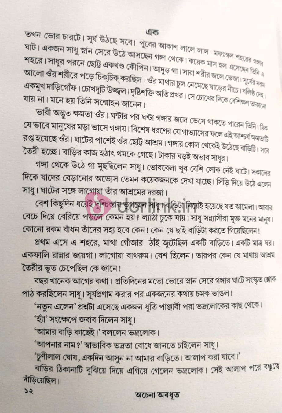 'অচেনা অবধূত' আখ্যানটি (আখ্যানই বলবো এখন থেকে কারণ লেখক গল্প বলার ঢঙেই পরিবেশন করেছেন গোটাটি) আরম্ভ হয় এক অচেনা সন্ন্যাসীর স্নানযাত্রা দিয়ে তার পরিসমাপ্তি ঘটেছে তাঁর সৎকারের সময়ের কিছু অবাঞ্ছিত কিছু ঘটনা দিয়ে। সন্ন্যাসীর পূর্বাশ্রম স্মরণে নিষেধ থাকলেও লেখকের সে দায় নেই তাই পাঠক একে একে জানতে পারেন, অবধূতের আসল নাম, তাঁর পরিজনদের পরিচয়, তাঁর সন্ন্যাস পূর্ব জীবনের নানান তথ্য, সর্বোপরী অবধূতের বিপ্লবী সংযোগের রোমহর্ষক কাহিনী। বীর বিপ্লবী মাস্টারদা সূর্য সেনের অমরত্বে অনুঘটকের কাজ করেছিলেন যে স্টোর কিপার দুলাল মুখুজ্যে তিনিই পরবর্তী পর্বে অবধূত হয়ে আত্মপ্রকাশ করেন।