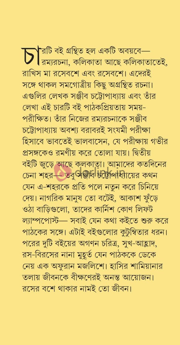 চারটি বই গ্রন্থিত হল একটি অবয়বে- রম্যরচনা, কলিকাতা আছে কলিকাতাতেই, রাখিস মা রসেবশে এবং রসেবশে। এদেরই সঙ্গে থাকল সমগোত্রীয় কিছু অগ্রন্থিত রচনা। এগুলির লেখক সঞ্জীব চট্টোপাধ্যায় এবং তাঁর লেখা এই চারটি বই পাঠকপ্রিয়তায় সময়-পরীক্ষিত।