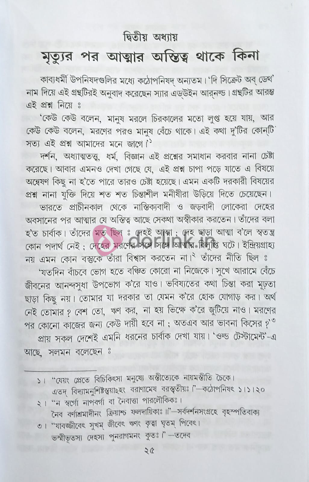 গ্রন্থের প্রথমার্ধে আত্মা, মৃত্যু এবং পুনর্জন্মের মতো গভীর বিষয়ের উপর দার্শনিক ও তাত্ত্বিক আলোচনার মাধ্যমে পাঠককে আত্মার প্রকৃতি ও তার অস্তিত্ব সম্পর্কিত বোধগম্য জ্ঞান প্রদান করা হয়েছে। এখানে আত্মা কী, মন ও মস্তিষ্কের সম্পর্ক, মৃত্যুর পর কী ঘটে — এসব প্রশ্নে বৈজ্ঞানিকতাকে প্রাধান্য দিয়ে যুক্তি তৈরি হয়েছে। একইসঙ্গে বিভিন্ন ধর্মের — বিশেষত হিন্দুধর্মের বেদান্ত দর্শন ও অন্যান্য ধর্মবিশ্বাসের তুলনামূলক অধ্যয়নও করা হয়েছে, জ্ঞানতত্ত্ব ও চিন্তার ভিন্নতার দিকটি ব্যাখ্যা করা হয়েছে। এই অধ্যায়ে স্বামী আত্মার প্রকৃতি নিয়ে প্রশ্ন তোলেন। আধুনিক বস্তুবাদী বিজ্ঞান ধরে যে “চেতনা শুধুই মস্তিষ্কের কার্যকলাপ,” তাই দেহ মৃত হলে চেতনাও ক্ষণভঙ্গুর হয়ে যায়। তিনি যুক্তি দেন: