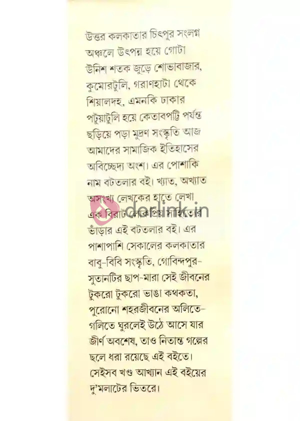 উত্তর কলকাতার চিৎপুর সংলগ্ন অঞ্চলে উৎপন্ন হয়ে গোটা উনিশ শতক জুড়ে শোভাবাজার, কুমোরটুলি, গরাণহাটা থেকে শিয়ালদহ, এমনকি ঢাকার পটুয়াটুলি হয়ে কেতাবপট্টি পর্যন্ত ছড়িয়ে পড়া মুদ্রণ সংস্কৃতি আজ আমাদের সামাজিক ইতিহাসের অবিচ্ছেদ্য অংশ। এর পোশাকি নাম বটতলার বই। খ্যাত, অখ্যাত অসংখ্য লেখকের হাতে লেখা এক বিরাট লোকপ্রিয় সাহিত্যের ভাঁড়ার এই বটতলার বই। এর পাশাপাশি সেকালের কলকাতার বাবু-বিবি সংস্কৃতি, গোবিন্দপুর-সুতানটির ছাপ-মারা সেই জীবনের টুকরো টুকরো ভাঙা কথকতা, পুরোনো শহরজীবনের অলিতে-গলিতে ঘুরলেই উঠে আসে যার জীর্ণ অবশেষ, তাও নিতান্ত গল্পের ছলে ধরা রয়েছে এই বইতে। সেইসব খণ্ড আখ্যান এই বইয়ের দু'মলাটের ভিতরে।