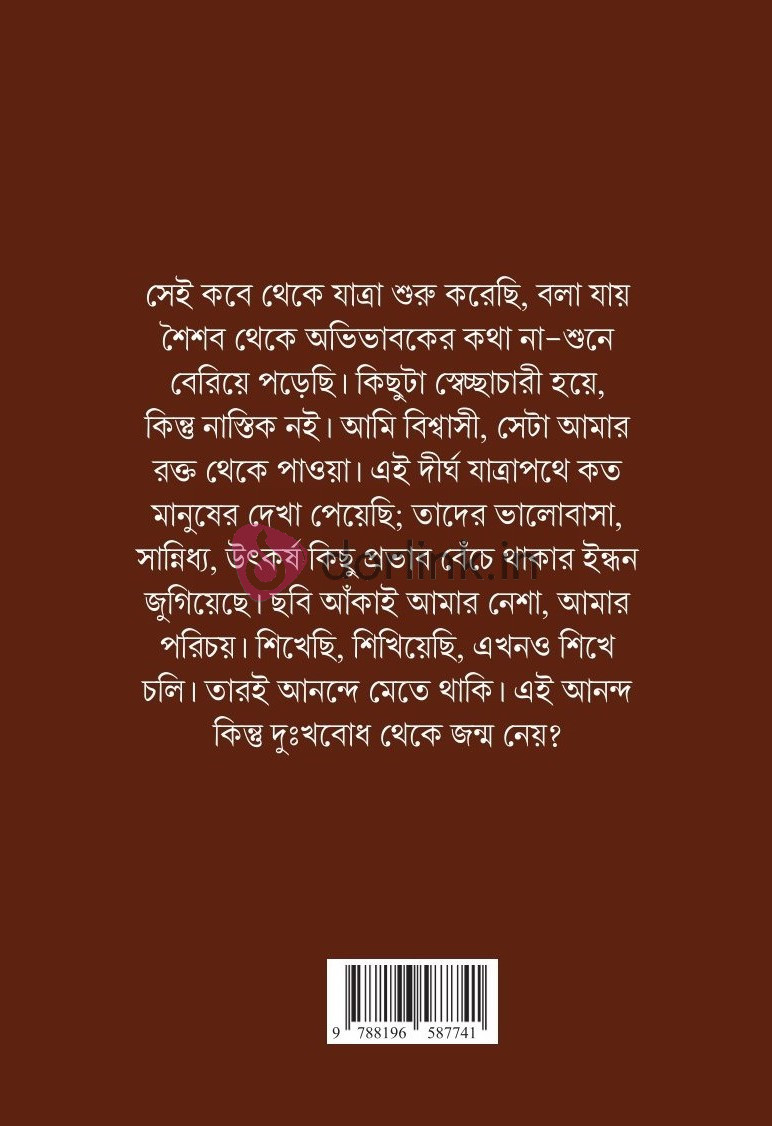সেই কবে থেকে যাত্রা শুরু করেছি, বলা যায় শৈশব থেকে অভিভাবকের কথা না-শুনে বেরিয়ে পড়েছি। কিছুটা স্বেচ্ছাচারী হয়ে, কিন্তু নাস্তিক নই। আমি বিশ্বাসী, সেটা আমার রক্ত থেকে পাওয়া। এই দীর্ঘ যাত্রাপথে কত মানুষের দেখা পেয়েছি; তাদের ভালোবাসা, সান্নিধ্য, উৎকর্ষ কিছু প্রভাব বেঁচে থাকার ইন্ধন জুগিয়েছে। ছবি আঁকাই আমার নেশা, আমার পরিচয়। শিখেছি, শিখিয়েছি, এখনও শিখে চলি। তারই আনন্দে মেতে থাকি। এই আনন্দ কিন্তু দুঃখবোধ থেকে জন্ম নেয়?