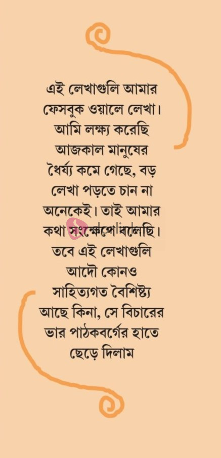 এই লেখাগুলি আমার ফেসবুক ওয়ালে লেখা। আমি লক্ষ্য করেছি আজকাল মানুষের ধৈর্য্য কমে গেছে, বড় লেখা পড়তে চান না অনেকেই। তাই আমার কথা সংক্ষেপে বলেছি। তবে এই লেখাগুলি আদৌ কোনও সাহিত্যগত বৈশিষ্ট্য আছে কিনা, সে বিচারের ভার পাঠকবর্গের হাতে ছেড়ে দিলাম