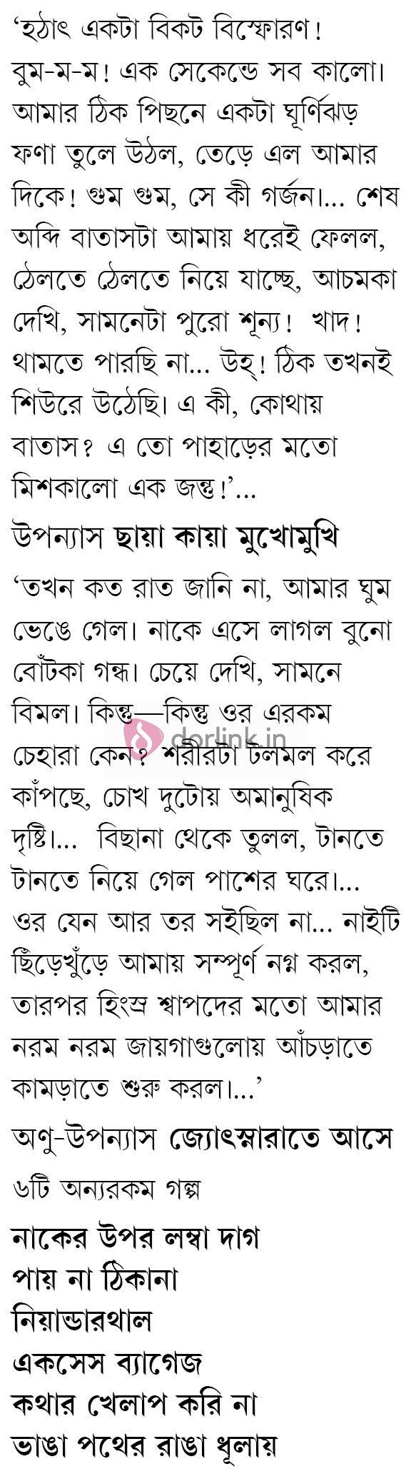 'তখন কত রাত জানি না, আমার ঘুম ভেঙে গেল। নাকে এসে লাগল বুনো বোঁটকা গন্ধ। চেয়ে দেখি, সামনে বিমল। কিন্তু-কিন্তু ওর এরকম চেহারা কেন? শরীরটা টলমল করে কাঁপছে, চোখ দুটোয় অমানুষিক দৃষ্টি।... বিছানা থেকে তুলল, টানতে টানতে নিয়ে গেল পাশের ঘরে।... ওর যেন আর তর সইছিল না... নাইটি ছিঁড়েখুঁড়ে আমায় সম্পূর্ণ নগ্ন করল, তারপর হিংস্র শ্বাপদের মতো আমার নরম নরম জায়গাগুলোয় আঁচড়াতে কামড়াতে শুরু করল।...'.... জ্যোৎস্নারাতে আসে (অণু-উপন্যাস)