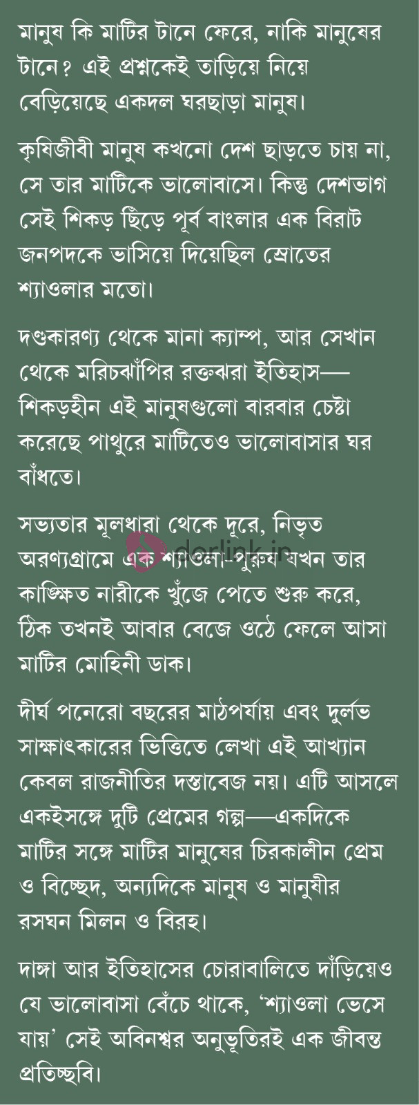 কৃষিজীবী মানুষ কখনো দেশ ছাড়তে চায় না, সে তার মাটিকে ভালোবাসে। কিন্তু দেশভাগ সেই শিকড় ছিঁড়ে পূর্ব বাংলার এক বিরাট জনপদকে ভাসিয়ে দিয়েছিল স্রোতের শ্যাওলার মতো। দণ্ডকারণ্য থেকে মানা ক্যাম্প, আর সেখান থেকে মরিচঝাঁপির রক্তঝরা ইতিহাস — শিকড়হীন এই মানুষগুলো বারবার চেষ্টা করেছে পাথুরে মাটিতেও ভালোবাসার ঘর বাঁধতে। সভ্যতার মূলধারা থেকে দূরে, নিভৃত অরণ্যগ্রামে এক শ্যাওলা-পুরুষ যখন তার কাঙ্ক্ষিত নারীকে খুঁজে পেতে শুরু করে, ঠিক তখনই আবার বেজে ওঠে ফেলে আসা মাটির মোহিনী ডাক।