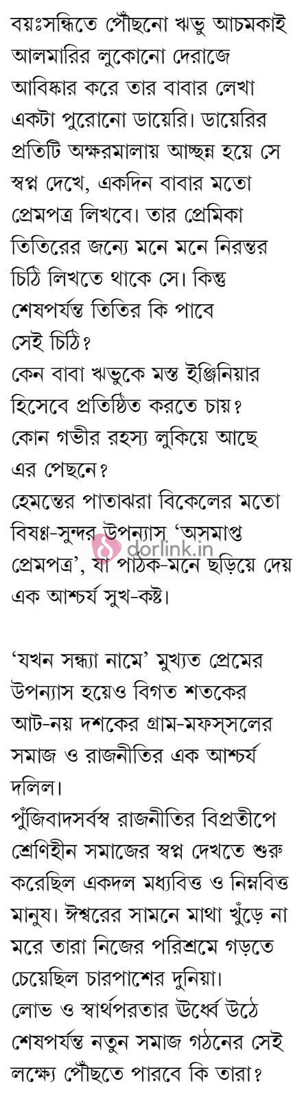 কেন বাবা ঋভুকে মস্ত ইঞ্জিনিয়ার হিসেবে প্রতিষ্ঠিত করতে চায়? কোন গভীর রহস্য লুকিয়ে আছে এর পেছনে? হেমন্তের পাতাঝরা বিকেলের মতো বিষণ্ণ-সুন্দর উপন্যাস 'অসমাপ্ত প্রেমপত্র', যা পাঠক-মনে ছড়িয়ে দেয় এক আশ্চর্য সুখ-কষ্ট।
