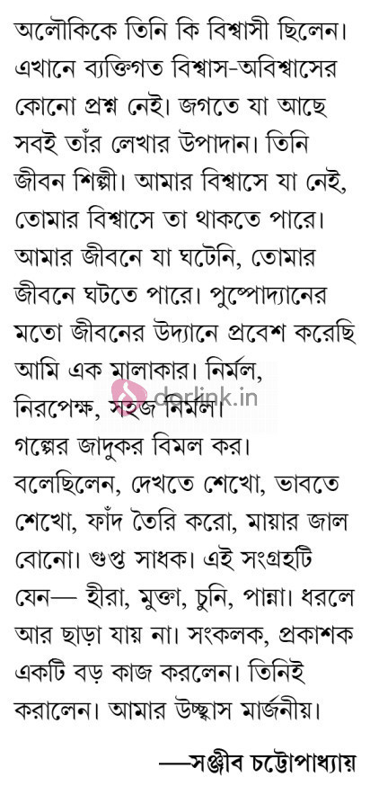 "অলৌকিকে তিনি কি বিশ্বাসী ছিলেন। এখানে ব্যক্তিগত বিশ্বাস-অবিশ্বাসের কোনো প্রশ্ন নেই। জগতে যা আছে সবই তাঁর লেখার উপাদান। তিনি জীবন শিল্পী। আমার বিশ্বাসে যা নেই, তোমার বিশ্বাসে তা থাকতে পারে। আমার জীবনে যা ঘটেনি, তোমার জীবনে ঘটতে পারে। পুষ্পোদ্যানের মতো জীবনের উদ্যানে প্রবেশ করেছি আমি এক মালাকার। নির্মল, নিরপেক্ষ, সহজ নির্মল। গল্পের জাদুকর বিমল কর। বলেছিলেন, দেখতে শেখো, ভাবতে শেখো, ফাঁদ তৈরি করো, মায়ার জাল বোনো। গুপ্ত সাধক। এই সংগ্রহটি যেন- হীরা, মুক্তা, চুনি, পান্না। ধরলে আর ছাড়া যায় না। সংকলক, প্রকাশক একটি বড় কাজ করলেন। তিনিই করালেন। আমার উচ্ছ্বাস মার্জনীয়।" -সঞ্জীব চট্টোপাধ্যায়