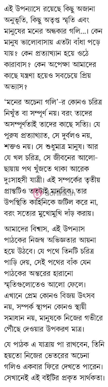 এই উপন্যাসে রয়েছে কিছু অজানা অনুভূতি, কিছু অতৃপ্ত স্মৃতি এবং মানুষের মনের অন্ধকার গলি...। কেন মানুষ ভালোবাসায় এতটা বাঁধা পড়ে যায়? কেন প্রত্যাখ্যান হয়ে ওঠে কারাবাস? কেন অপেক্ষা আমাদের কাছে যন্ত্রণা হয়েও সবচেয়ে প্রিয় অভ্যাস?