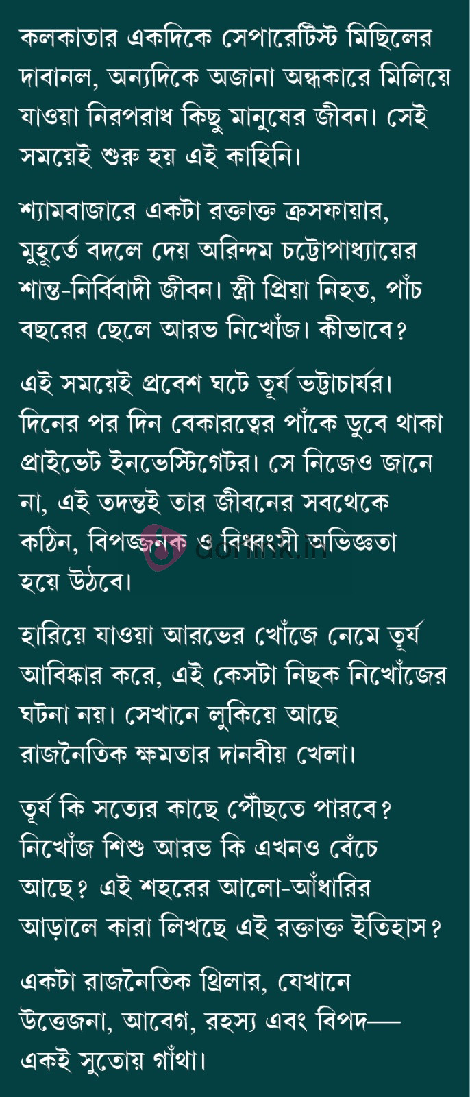তুর্য কি সত্যের কাছে পৌঁছতে পারবে? নিখোঁজ শিশু আরভ কি এখনও বেঁচে আছে? এই শহরের আলো-আঁধারির আড়ালে কারা লিখছে এই রক্তাক্ত ইতিহাস?