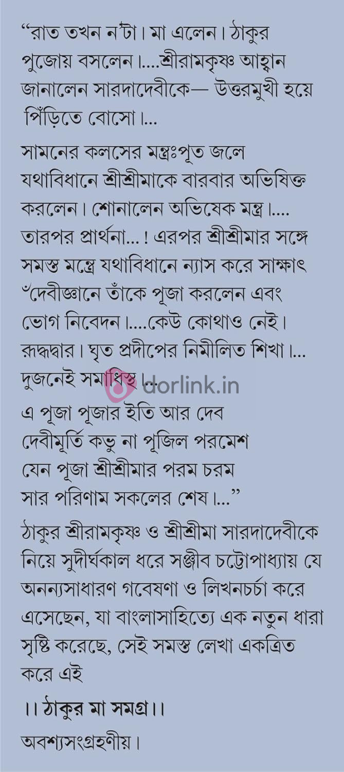 ঠাকুর মা সমগ্র মূলত ভক্ত সঞ্জীব চট্টোপাধ্যায়ের পক্ষ থেকে দেবতার উদ্দেশে নিবেদিত এক প্রার্থনা। গভীরভাবে নিমগ্ন করে রাখার মতো এই গ্রন্থ এমনকি সবচেয়ে নাস্তিক মানুষের মধ্যেও লুকিয়ে থাকা সামান্যতম আধ্যাত্মিক অনুভূতিকেও জাগিয়ে তুলতে সক্ষম।