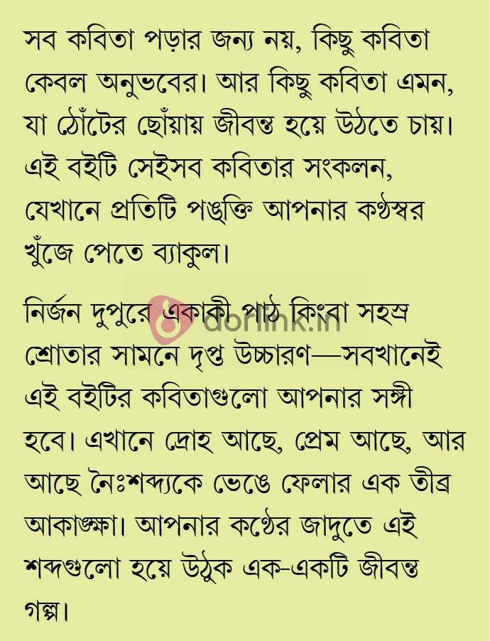 নির্জন দুপুরে একাকী পাঠ কিংবা সহস্র শ্রোতার সামনে দৃপ্ত উচ্চারণ—সবখানেই এই বইটির কবিতাগুলো আপনার সঙ্গী হবে। এখানে দ্রোহ আছে, প্রেম আছে, আর আছে নৈঃশব্দ্যকে ভেঙে ফেলার এক তীব্র আকাঙ্ক্ষা। আপনার কণ্ঠের জাদুতে এই শব্দগুলো হয়ে উঠুক এক-একটি জীবন্ত গল্প।