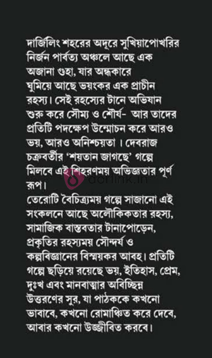 দার্জিলিং শহরের অদূরে সুখিয়াপোখরির নির্জন পার্বত্য অঞ্চলে আছে এক অজানা গুহা, যার অন্ধকারে ঘুমিয়ে আছে ভয়ংকর এক প্রাচীন রহস্য। সেই রহস্যের টানে অভিযান শুরু করে সৌম্য ও শৌর্য- আর তাদের প্রতিটি পদক্ষেপ উন্মোচন করে আরও ভয়, আরও অনিশ্চয়তা। দেবরাজ চক্রবর্তীর 'শয়তান জাগছে' গল্পে মিলবে এই শিহরণময় অভিজ্ঞতার পূর্ণ রূপ।
