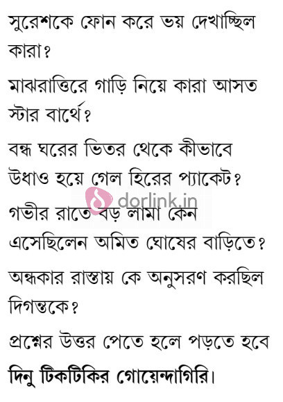 ‘দিনু টিকটিকি’ ওরফে প্রফেসর দিগন্ত দেব এবং তাঁর বন্ধু কলকাতা পুলিশ গোয়েন্দা বিভাগের অমায়িক ইন্সপেক্টর প্রণয় বোস। দিনুর তীক্ষ্ণ বুদ্ধি ও প্রণয়ের পুলিশি ক্ষিপ্রতা যেন সোনায় সোহাগা। এই মানিকজোড় যেখানে, সেখানেই ছিন্নভিন্ন রহস্যের নিকষ অন্ধকার জাল!
