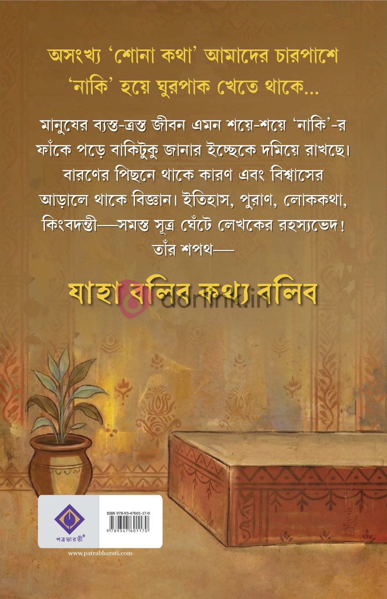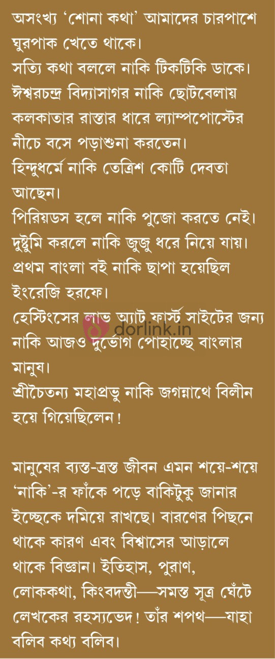 মানুষের ব্যস্ত-ত্রস্ত জীবন এমন শয়ে-শয়ে 'নাকি'-র ফাঁকে পড়ে বাকিটুকু জানার ইচ্ছেকে দমিয়ে রাখছে। বারণের পিছনে থাকে কারণ এবং বিশ্বাসের আড়ালে থাকে বিজ্ঞান। ইতিহাস, পুরাণ, লোককথা, কিংবদন্তী - সমস্ত সূত্র ঘেঁটে লেখকের রহস্যভেদ! তাঁর শপথ-যাহা বলিব কথ্য বলিব।