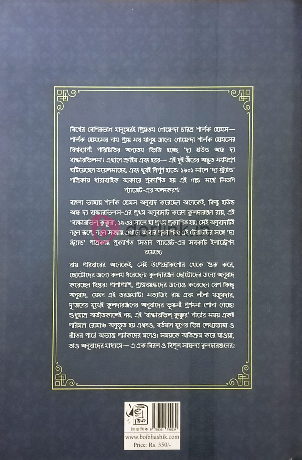বাংলা ভাষায় শার্লক হোমস অনুবাদ করেছেন অনেকেই, কিন্তু হাউন্ড অফ দ্য বাস্কারভিলস-এর প্রথম অনুবাদটি করেন কুলদারঞ্জন রায়, এই 'বাস্কারভিল্ কুকুর', ১৯৩৪ সালে যা প্রথম প্রকাশিত হয়। সেই অনুবাদটিই নতুন রূপে, নতুন সজ্জায় এখানে আবার প্রকাশিত। এই টেক্সটটির সঙ্গে 'দ্য স্ট্র্যান্ড' পত্রিকায় প্রকাশিত সিডনি প্যাজেট-এর সবকটি ইলাস্ট্রেশন রয়েছে।