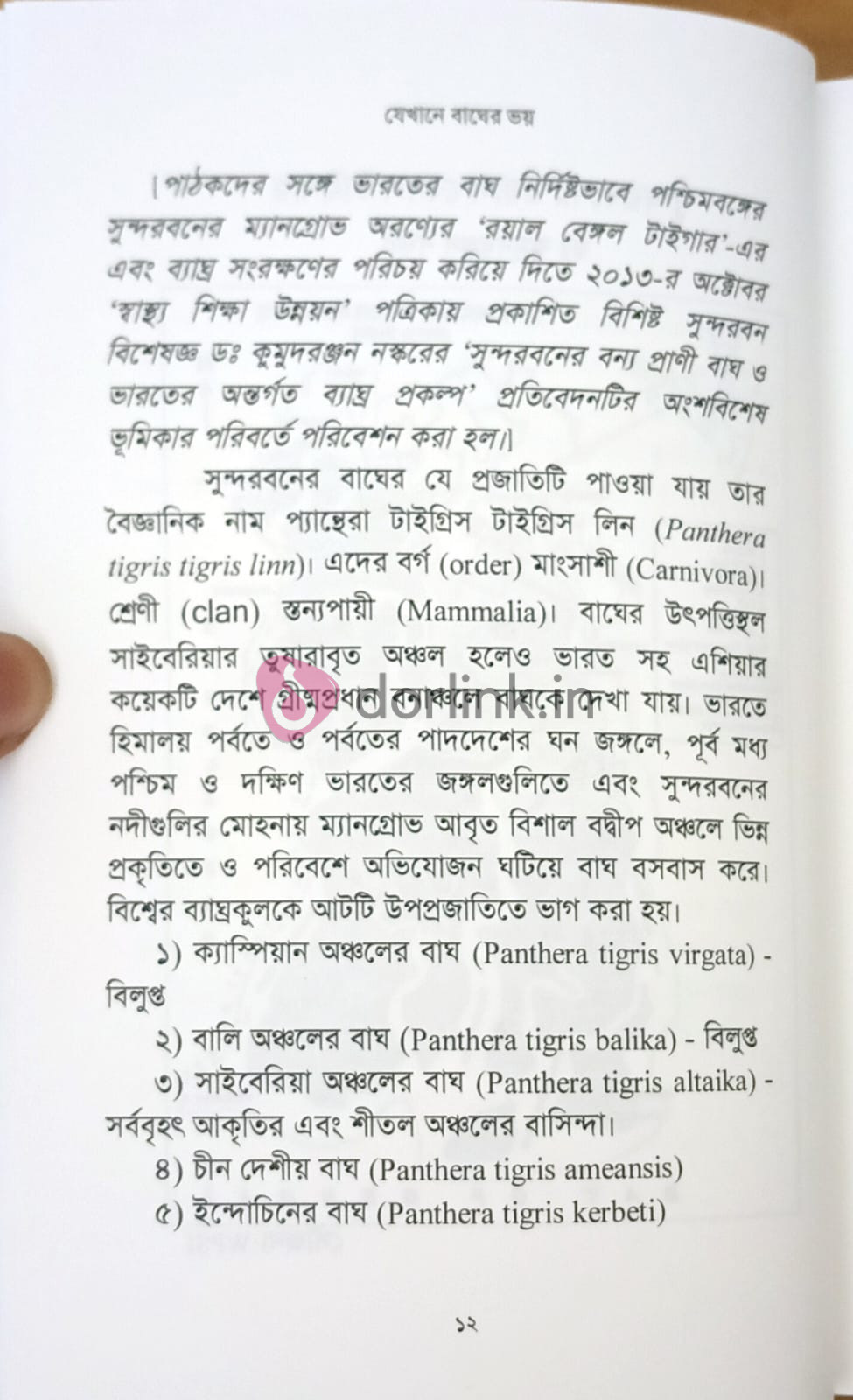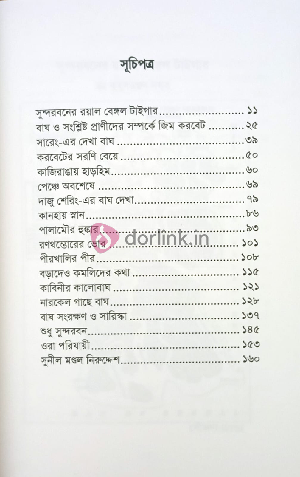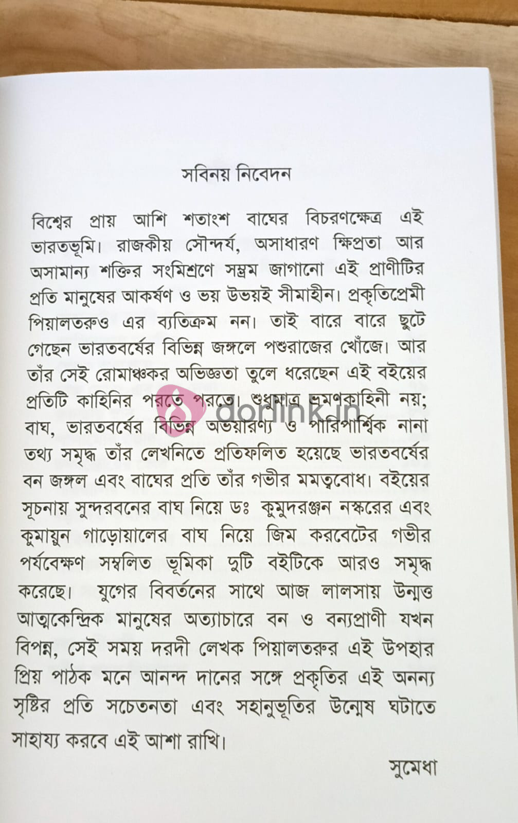 বাঘ, ভারতবর্ষের বিভিন্ন অভয়ারণ্য ও পারিপার্শ্বিক নানা তথ্যে সমৃদ্ধ বইটিতে প্রতিফলিত হয়েছে ভারতবর্ষের বনজঙ্গল এবং বাঘের প্রতি তাঁর গভীর মমত্ববোধ। বইয়ের সূচনায় সুন্দরবনের বাঘ নিয়ে ডঃ কুমুদ রঞ্জন নস্করের এবং কুমায়ুন গাড়োয়ালের বাঘ নিয়ে জিম করবেটের গভীর পর্যবেক্ষণ সম্বলিত প্রবন্ধদুটি বইটিকে আরও সমৃদ্ধ করেছে।