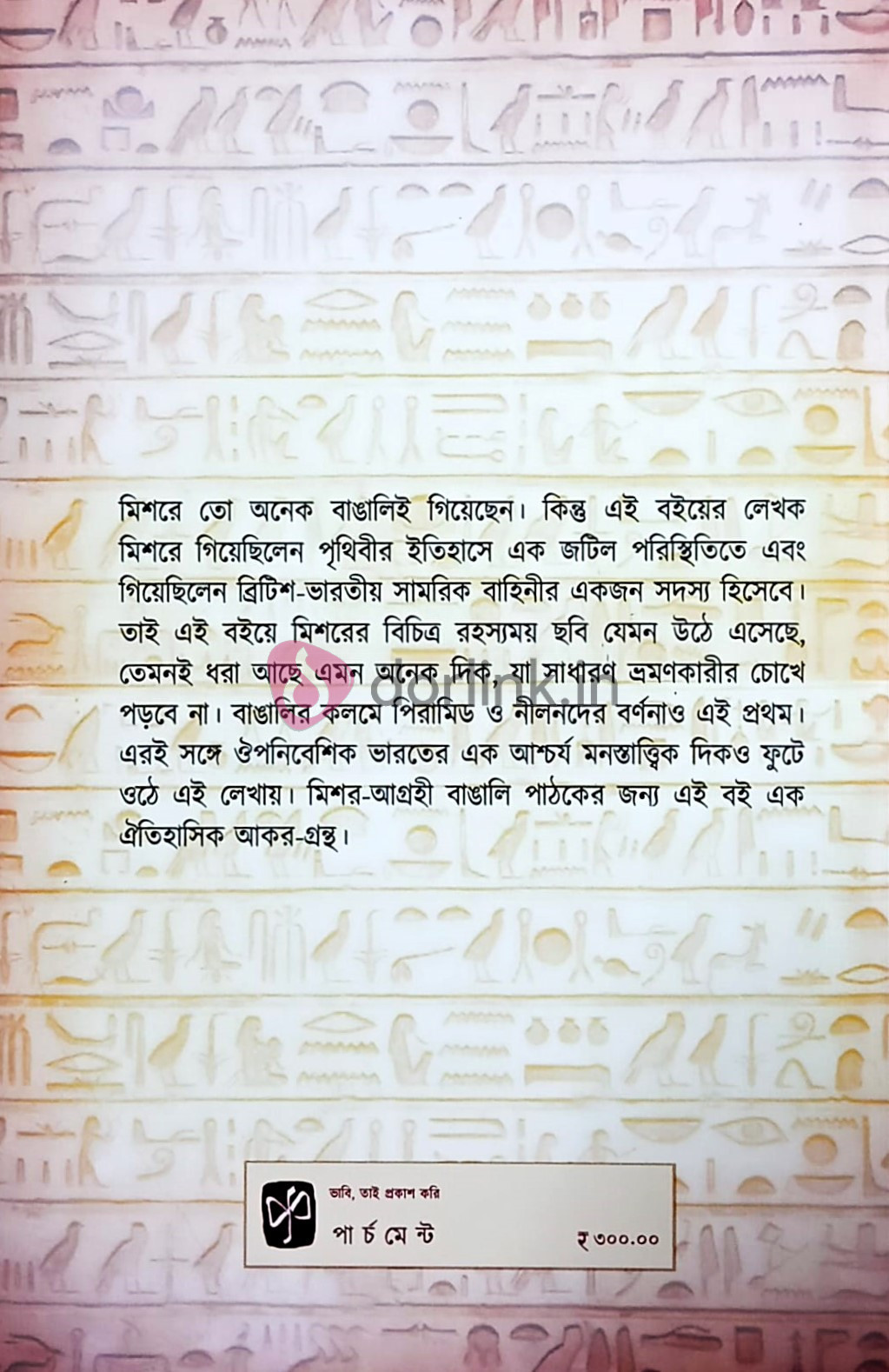 বাঙালির কলমে পিরামিড ও নীলনদের বর্ণনাও এই প্রথম। এরই সঙ্গে ঔপনিবেশিক ভারতের এক আশ্চর্য মনস্তাত্ত্বিক দিকও ফুটে ওঠে এই লেখায়। এভাবেই গড়ে উঠতে থাকে কোনো বাঙালির লেখা মিশর-সম্বন্ধীয় প্রথম বই। মিশর-আগ্রহী বাঙালি পাঠকের জন্য এই বই এক ঐতিহাসিক আকর-গ্রন্থ।