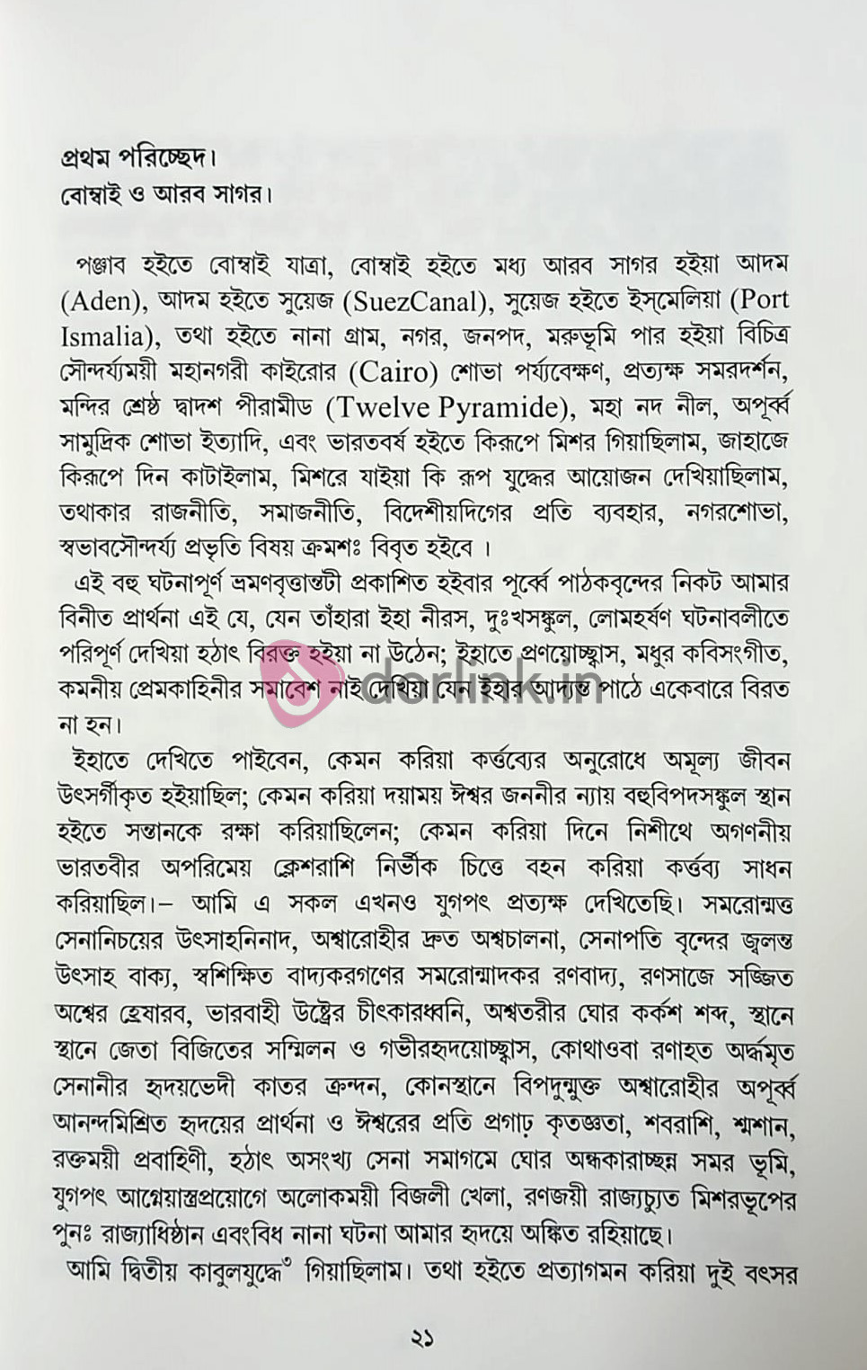 তাই এই বইয়ে মিশরের বিচিত্র রহস্যময় ছবি যেমন উঠে এসেছে, তেমনই ধরা আছে এমন অনেক দিক, যা সাধারণ ভ্রমণকারীর চোখে পড়বে না। তিনি বাঙালি। কর্মসূত্রে তিনি ইঙ্গ-ভারতীয় সেনাবাহিনীর সদস্য। যুদ্ধসূত্রে সেনাবাহিনীর সঙ্গেই তাঁকে যেতে হয়েছিল মিশরে। সেকালে সাধারণত যেসব ভারতীয় মিশরে যেতেন, তাঁরা মিশর ছুঁয়ে চলে যেতেন ইউরোপে। কিন্তু তাঁকে যুদ্ধের কর্মোপলক্ষেই দীর্ঘসময় থাকতে হল মিশরে। প্রথম পিরামিড নীলনদ ফারাও হাইরোগ্লিফ আর আশ্চর্য দেবদেবীদের দেশ দেখার অভিজ্ঞতা লিখে রাখতে থাকেন তিনি। আর তাঁর পেশাসূত্রে দেখতে পাওয়া মিশরের ইতিহাসের অন্য একটি দিকও জুড়ে যেতে থাকে তাঁর লেখায় -- ঔপনিবেশিক মিশরের কথা।