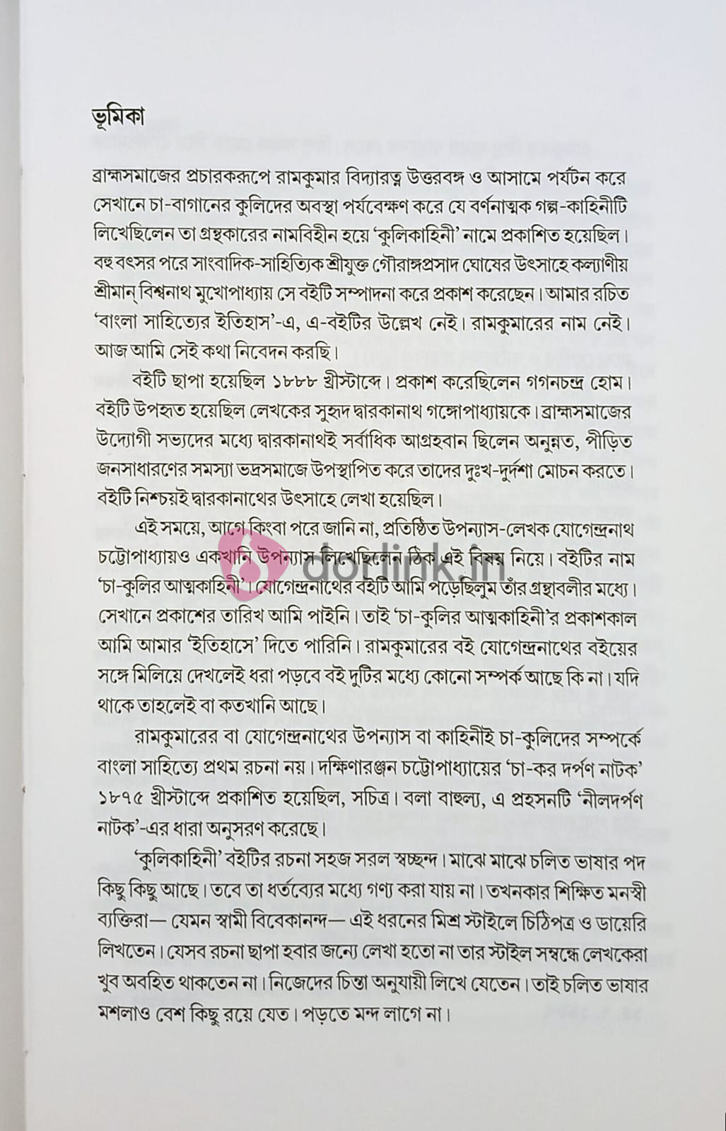 ব্রাহ্মসমাজের প্রচারকরূপে রামকুমার বিদ্যারত্ন উত্তরবঙ্গ ও আসাম পর্যটন করে সেখানে চা-বাগানের কুলিদের অবস্থা পর্যবেক্ষণ করে যে বর্ণনাত্মক গল্প-কাহিনিটি লিখেছিলেন তা গ্রন্থকারের নামবিহীন হয়ে 'কুলিকাহিনী' নামে প্রকাশিত হয়েছিল।